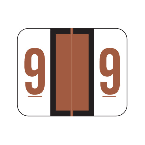 Smead BCCRN numeric labels feature a wrap-around brown bar outlined in black with a brown number on a white background. The number will be visible on each side of the folder when applied. Each label is 1"H x 1-1/4"W before folding.