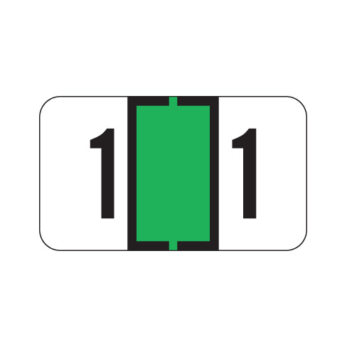 Traco numeric labels feature a wrap-around green bar outlined in black and a black number on a white background. The number will be visible on each side of the folder when applied. Each label is 15/16"H x 1-5/8"W before folding.