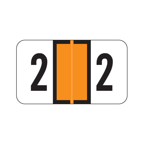 Traco numeric labels feature a wrap-around orange bar outlined in black and a black number on a white background. The number will be visible on each side of the folder when applied. Each label is 15/16"H x 1-5/8"W before folding.
