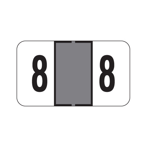 Traco numeric labels feature a wrap-around gray bar outlined in black and a black number on a white background. The number will be visible on each side of the folder when applied. Each label is 15/16"H x 1-5/8"W before folding.