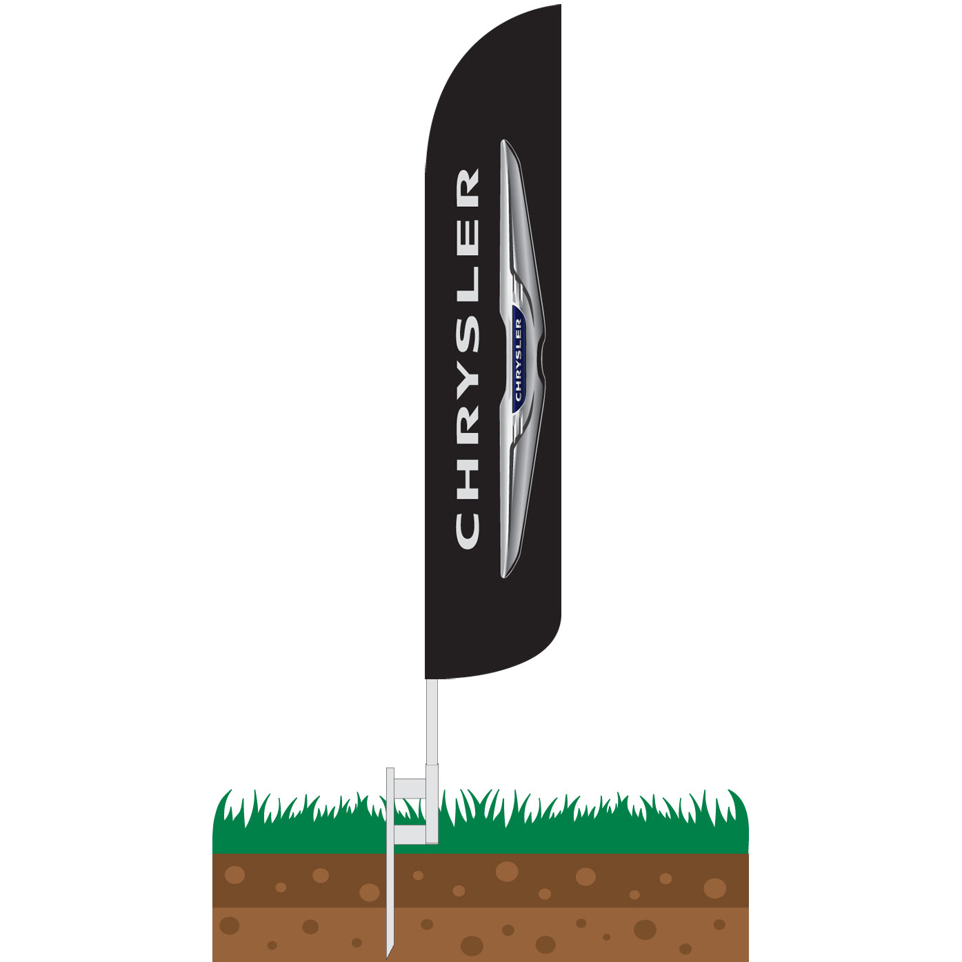 Chrysler Wind-Free Feather Flag features a black background with the Chrysler logo and text