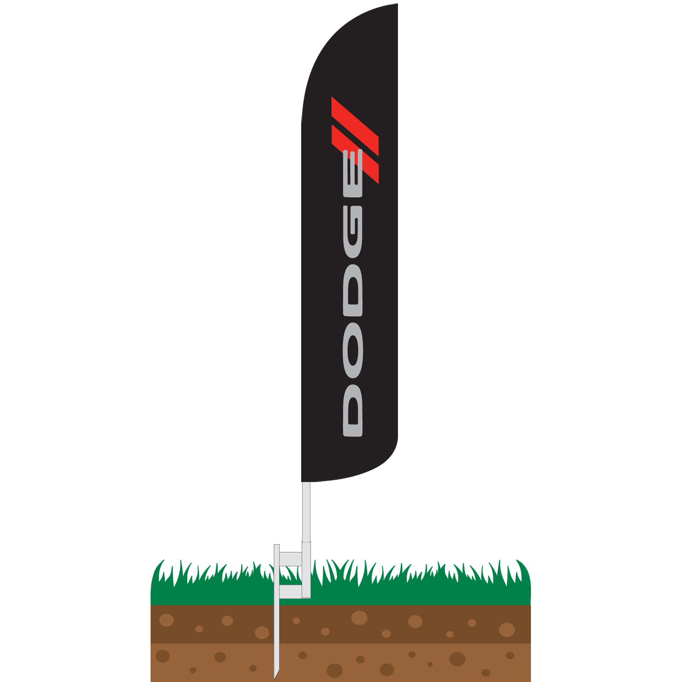 Dodge Wind-Free Feather Flag features a black background with the Dodge logo and text.