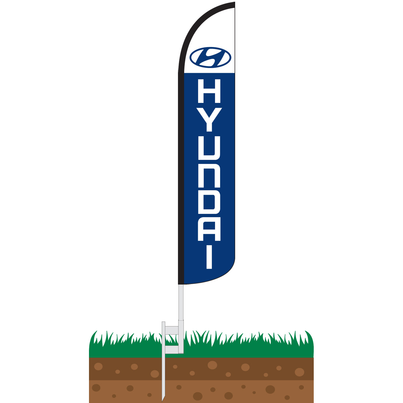 Hyundai Wind-Free Feather Flag features a white upper field with the Hyundai emblem printed in blue. Beneath that is a blue field with the Hyundai text emblazoned in white.