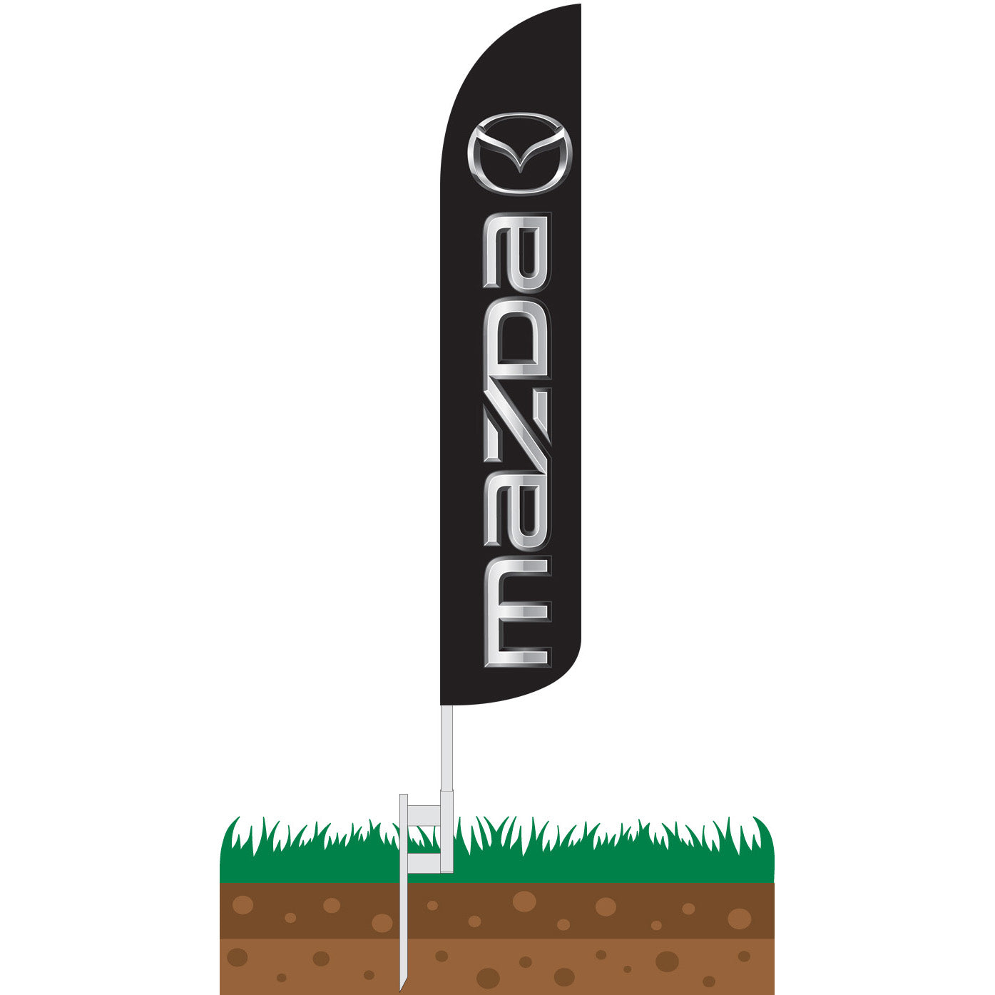 Mazda Wind-Free Feather Flag features a black field with the Mazda text running vertically. Above that, the flag is adorned with the Mazda logo.