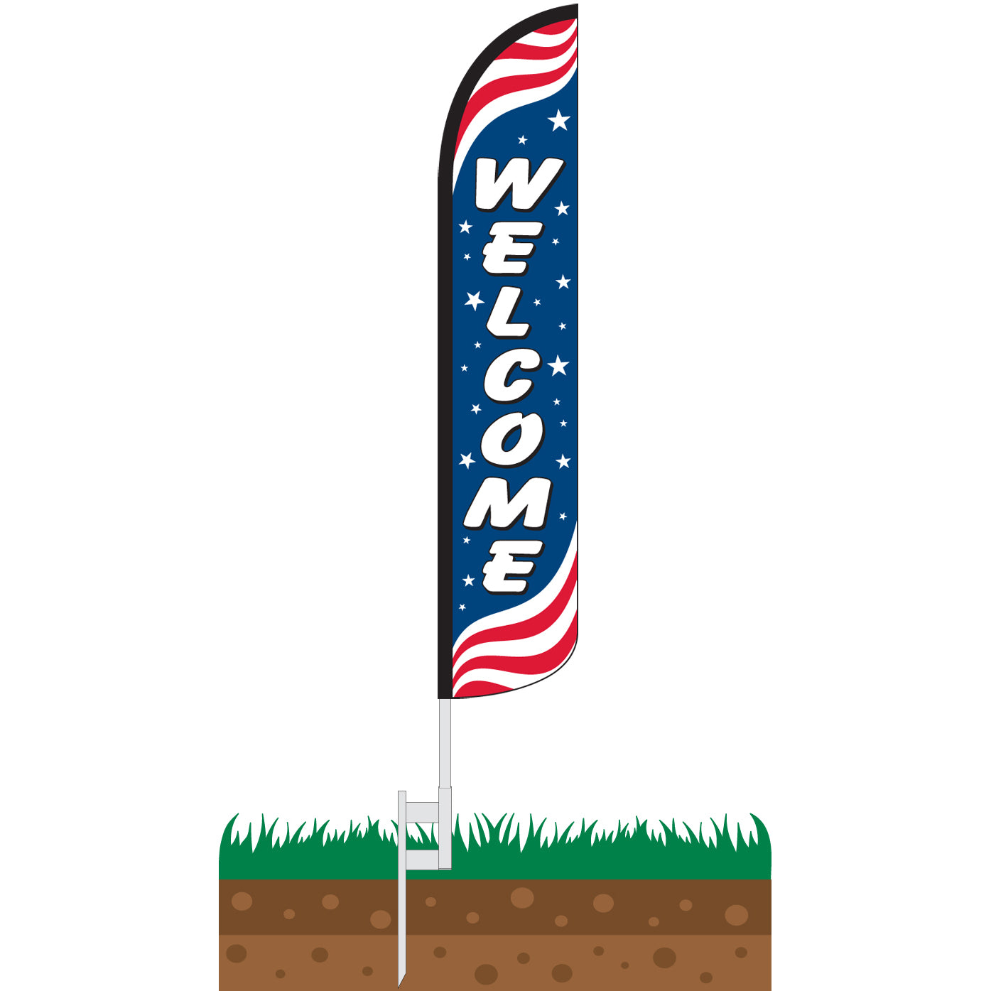 Welcome Patriotic Wind-Free Feather Flag Features an upper and lower red/white striped swirl pattern. The middle of the flag features a blue background with white stars and bold text reading, "Welcome."