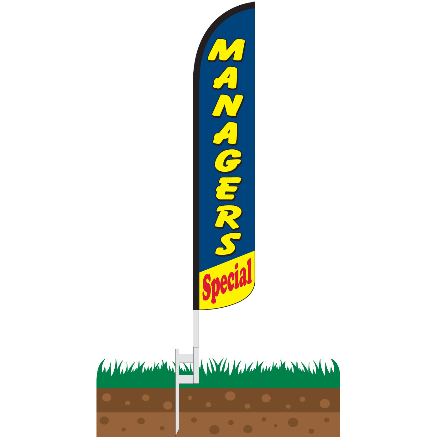 Managers Special Wind-Free Feather Flag features a blue background with bold yellow text outlined in black that reads, "Managers." Beneath that is a lower yellow field with bold red text reading, "Special."