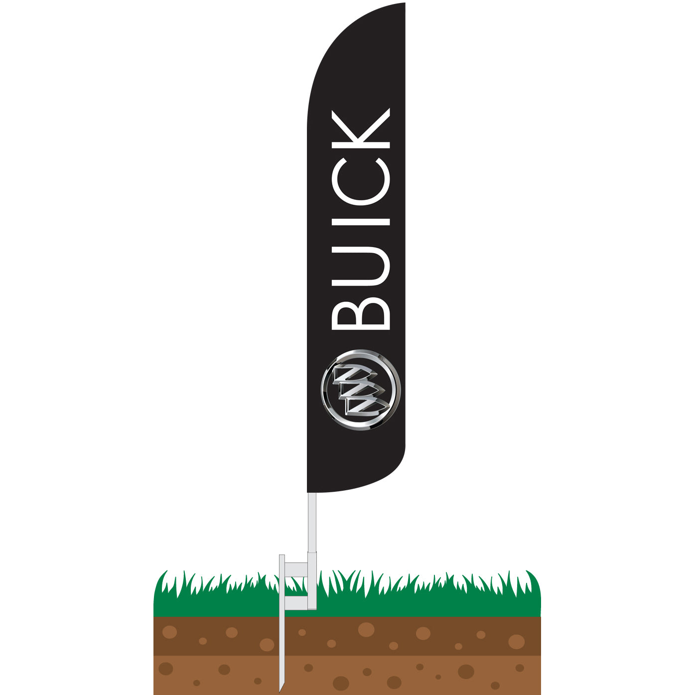 Buick Wind-Free Feather Flag features a black background with the full color shaded Buick logo on the bottom with the Buick text in white running from the bottom to the top of the flag.