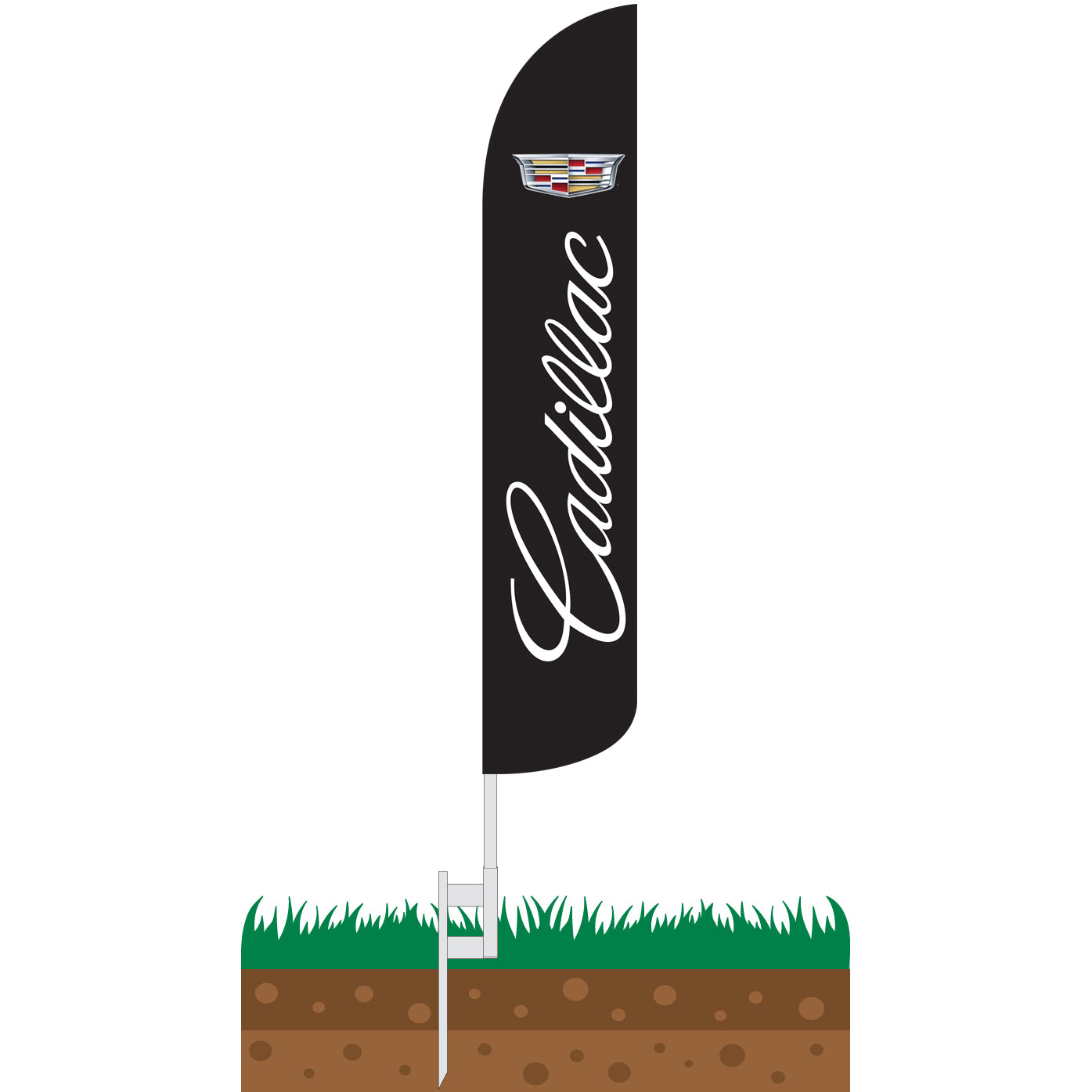 Cadillac Wind-Free Feather Flag features a black background with the full color iconic Cadillac logo printed at the top. Beneath that is the white Cadillac script text printed horizontally going from the bottom of the flag to the top.