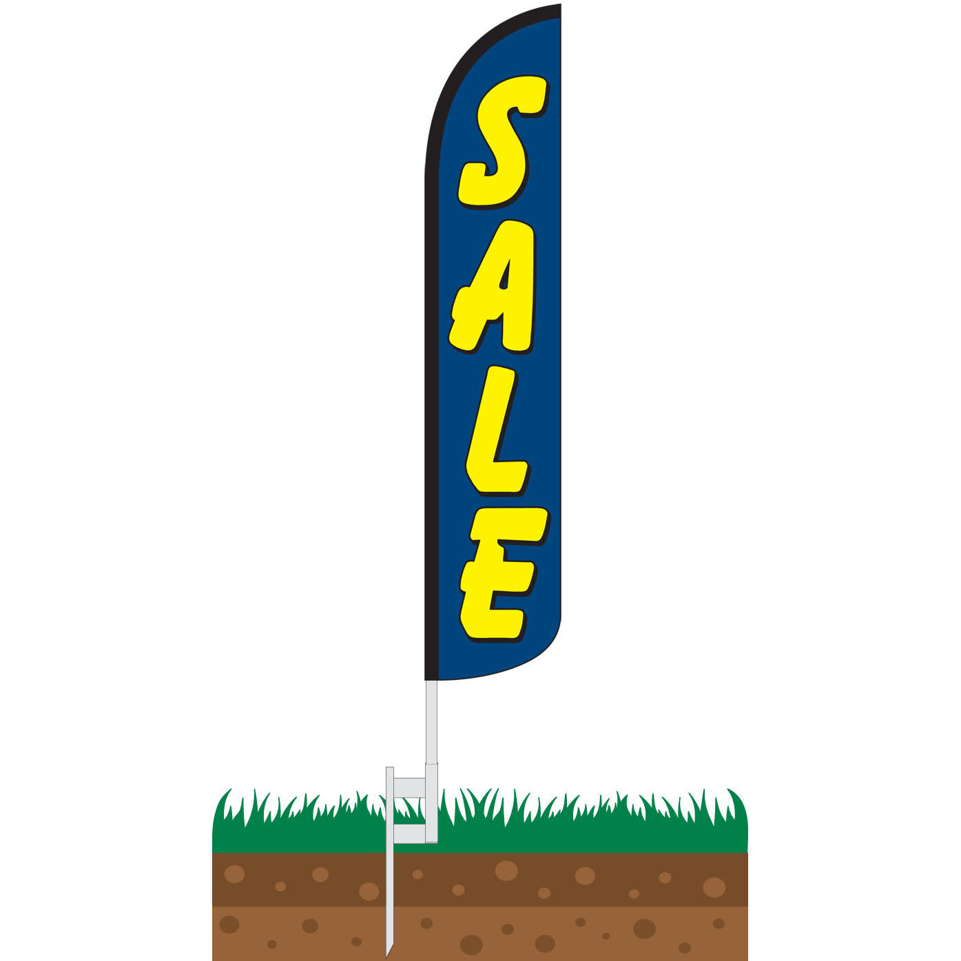 Sale (Blue & Yellow) Wind-Free Feather Flag Features a blue background with bold yellow text outlined in black that reads, "Sale."